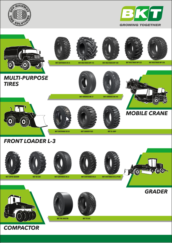 Строительные шины BKT. Многоцелевая техника, автокраны, фронтальные погрузчики и бульдозеры, грейдеры, пневмоколесные катки. 2023